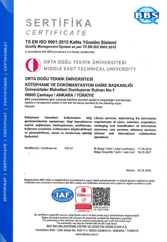 In ODTÜ Library, Quality Management System has been constituted, documented, and necessary mechanisms have been established to ensure continuity and to constantly improve the Library in accordance with the requirements stipulated by the ISO 9001: 2015 Quality Management System standards. ODTÜ Library creates all its services based on the information requirements of the users and accepts user satisfaction as a basic indicator of service quality.